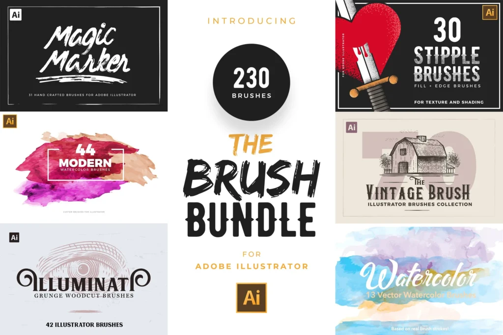 This is your chance to grab a collection of 230 diverse illustrator brushes from